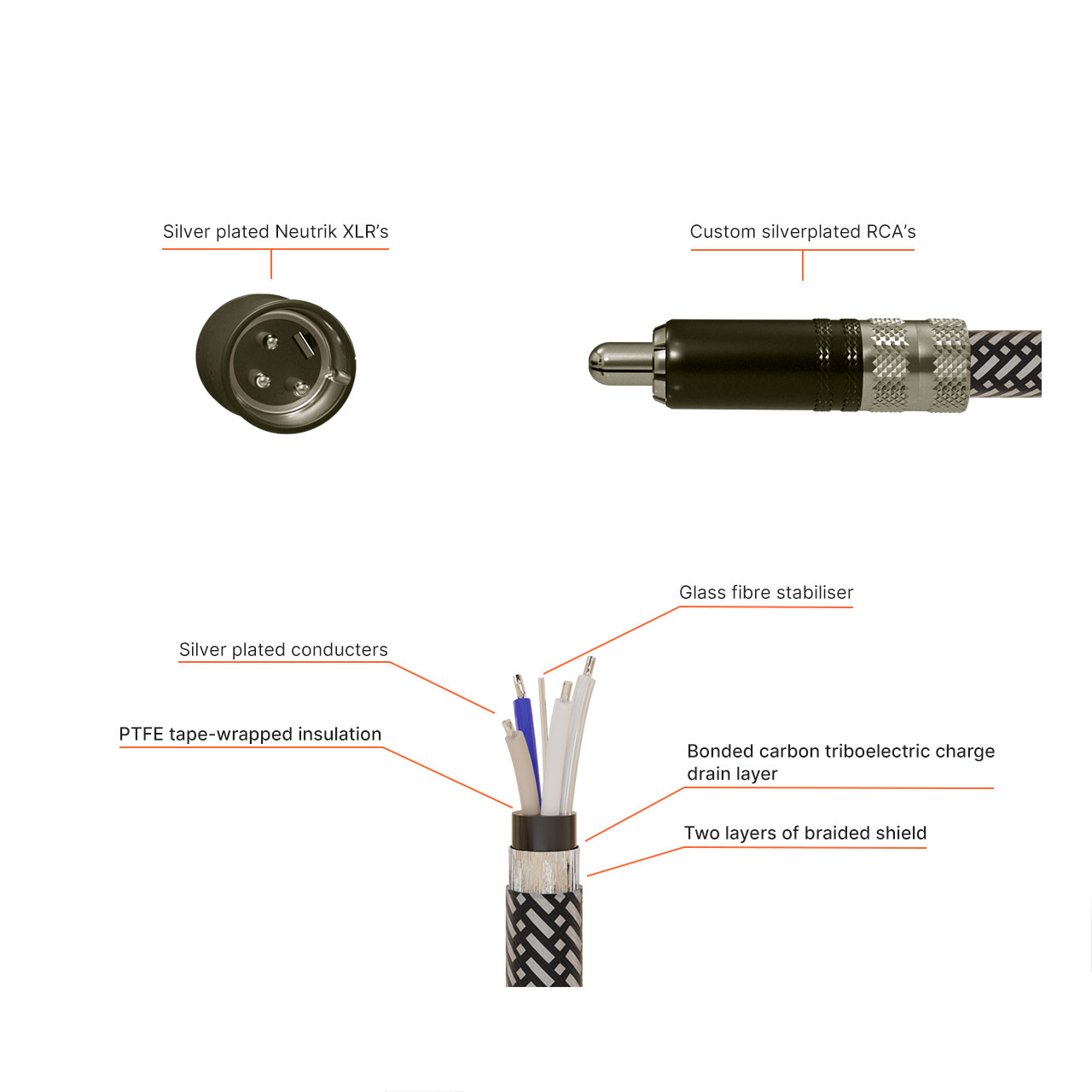 Look no further if you want the perfect link between our PreAmplifier Kit, Nilai power amplifiers or active (fusion amp powered) loudspeakers. The RCA - XLR interconnects have silver plated plated connectors to guarantee an optimal, uncolored signal transmission. Hypex Direct Interconnects are the best protected audio signal cables in the industry because of their Silver-plated conductors with PTFE tape-wrapped insulation, glass-fibre stabilisers and two layers of braided shield over a bonded carbon triboelectric charge drain layer.